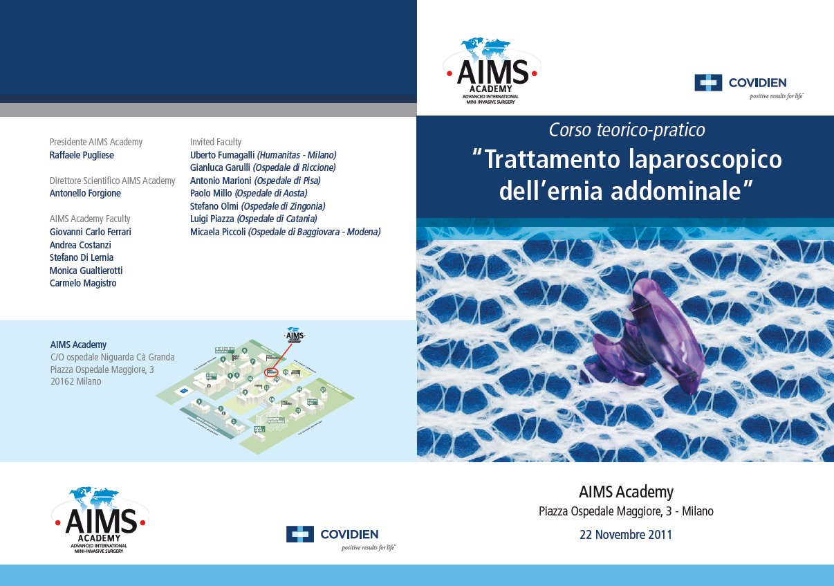 Milano 22 Novembre 2011, AIMS Academy, Piazza Ospedale Maggiore, 3 - Ospedale Niguarda Milano - FACULTY: Pr. Raffaele Pugliese (Niguarda), Antonello Forgione (Niguarda), Uberto Fumagalli (Humanitas - Milano), Antonio Marioni (Ospedale di Pisa), Gianluca Garulli (Ospedale di Riccione), Paolo Millo (Ospedale di Aosta), Micaela Piccoli (Ospedale di Baggiovara - Modena), Stefano Olmi (Ospedale di Zingonia), Luigi Piazza (Ospedale di Catania)
